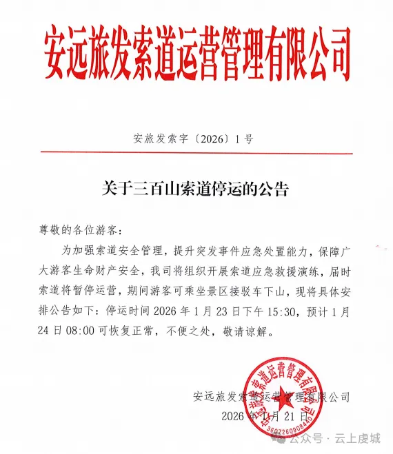 大家好!赣州旅游年卡运营中心接到会昌紫云山景区的通知,受低温寒潮冻雨天气影响,为保障游客安全与游览体验,紫云山景区将于2026年1月21日(周三)至1月22日(周四)临时闭园两日。景区计划于2026年1月23日(周五)恢复正常开放。各位年卡用户请勿跑空,由此给您带来的不便敬请谅解!