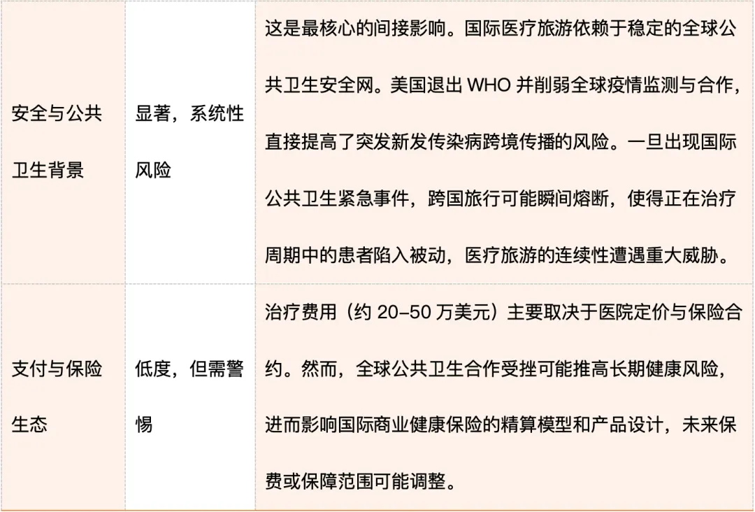 3. 患者决策因子的权重改变:潜在的国际患者及其顾问在评估赴美治疗时,将不得不将“地缘政治稳定性”和“全球公共卫生合作水平”纳入风险评估框架,与医疗技术水平、费用进行权衡。一个在公共卫生领域倾向于孤立主义的国家,其作为长期医疗目的地的吸引力会打上折扣。