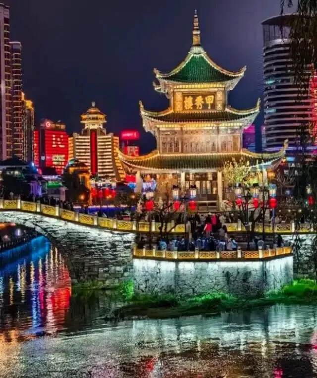 贵阳的标志性建筑,免费开放周二至周日9:00-18:00开放,周一闭馆(节假日除外)。我们试过上午和傍晚两趟,发现最舒服的是19:30-21:00的蓝调时刻,灯光亮起,南明河的倒影和古楼相映,像水墨画一样。浮玉桥的石墩是绝佳机位,我和老伴背对着镜头牵手散步,拍出来的照片非常有氛围感。避坑提醒:周末10点到下午4点旅行团扎堆,建议早去或傍晚错峰,周边的曹状元街可以顺便吃碗肠旺面,红油香而不腻,老伴不爱吃辣都偷偷加了两勺。