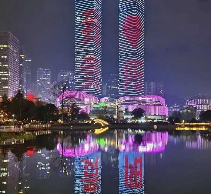 不用花钱买门票,就能欣赏到贵阳最震撼的夜景。白宫(花果园艺术中心)和双子塔相邻,19:30后灯光陆续亮起,20点后完全点亮,整座建筑像赛博宫殿般璀璨。最佳拍摄点在花果东门,隔着马路能拍到白宫全景和水中倒影,天桥上则适合拍半身照,以双子塔为背景氛围感拉满。我和老伴,晚上8点站在天桥,看着灯光变换,耳边是本地人的闲谈和孩子的笑声,既热闹又治愈。交通:地铁3号线到花果园站,步行10分钟可达,建议错峰21点后去,人少更易拍照。