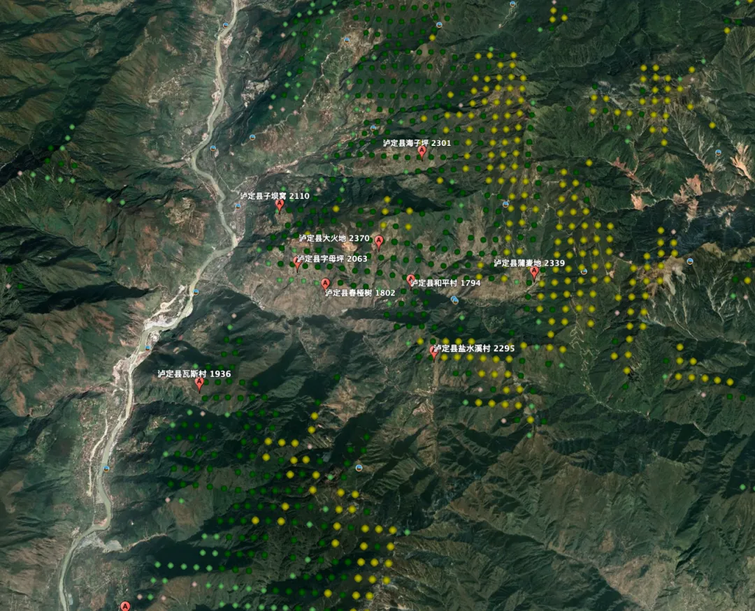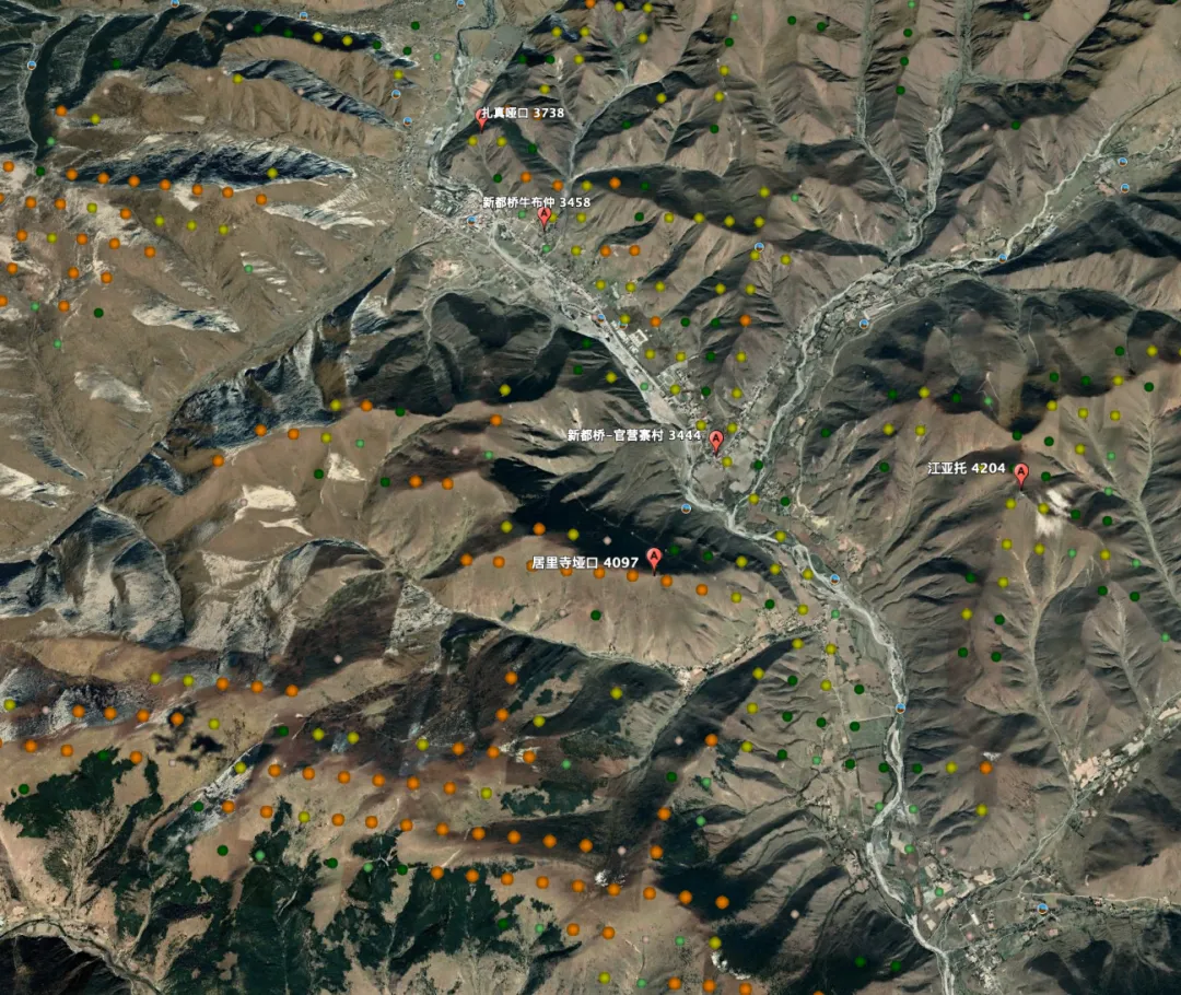 颜色越深、点位越大:代表该位置贡嘎山露出的山体范围越广、遮挡越少,观测效果越佳,大概率是绝佳观景点;