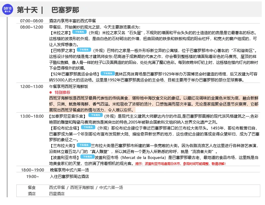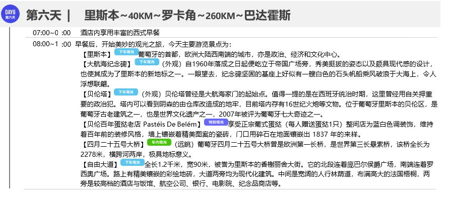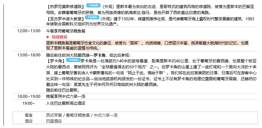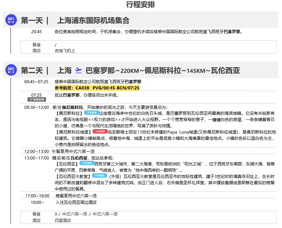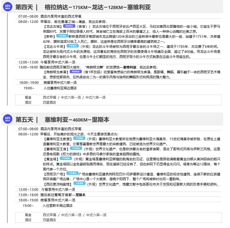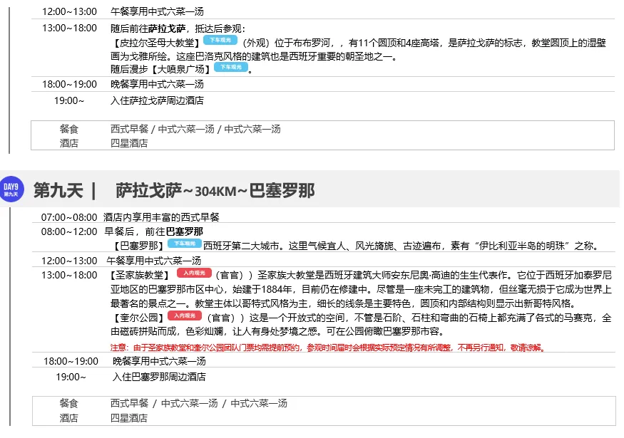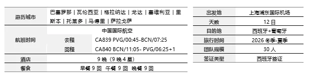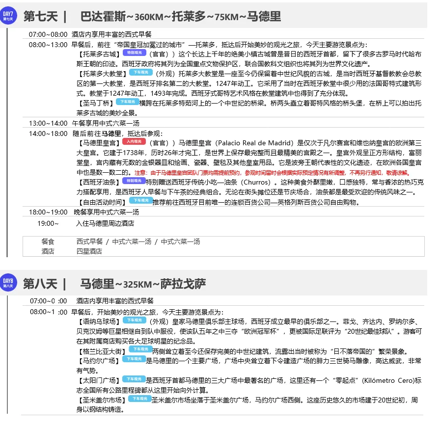 ◎ 行程中所列午晚餐共计18顿,其中中式团餐六菜一汤16顿、葡萄牙鳕鱼餐1顿、西班牙海鲜饭1顿,具体安排见行程(行程中公里数较长的午、晚餐)游有权根据实际情况安排相应标准的西式简餐或选择退餐费15欧/人/餐以保证行程的顺利进行)