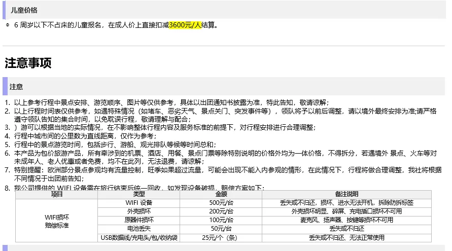 ◎ 如您选择单人入住大床房,全程房差人民币3600元(当大床 房满房时会安排双标间)。因客人个人原因取消行程,需要根据以下标准支付已经发生的旅游费用: