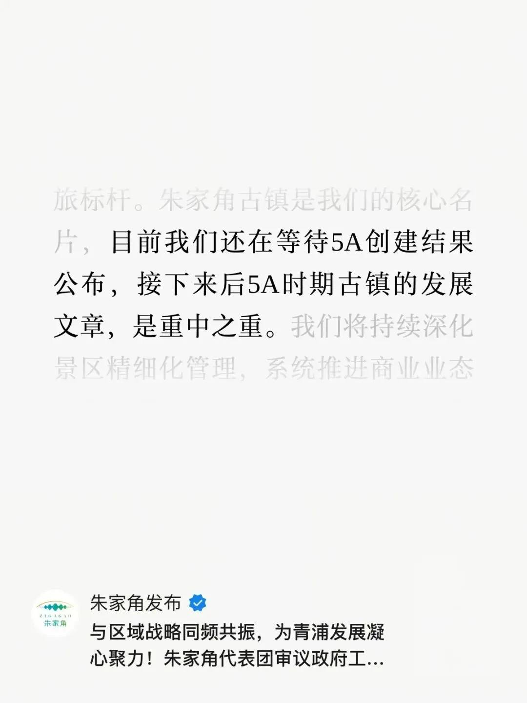 近日,朱家角官媒在报道两会代表发言时提到,“目前我们还在等待5A创建结果公布,接下来后5A时期古镇的发展文章,是重中之重。”