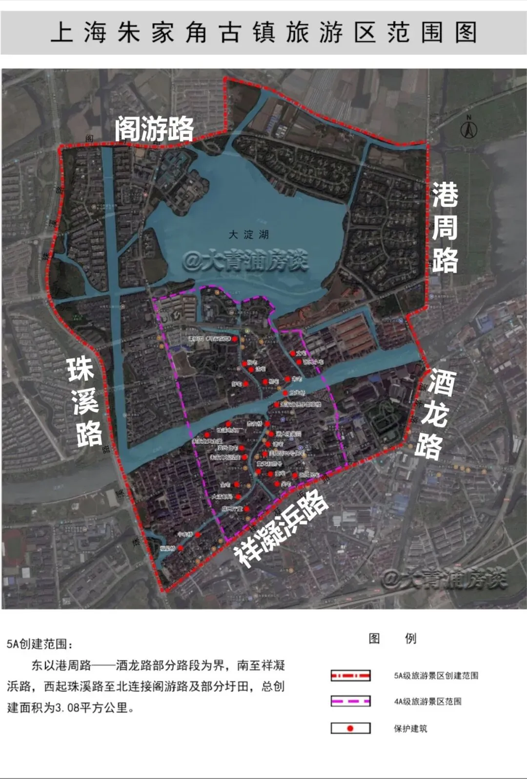 朱家角古镇国家5A级旅游景区创建范围,东以港周路、酒龙路为界,南至祥凝浜路,西起珠溪路,北接阁游路,总创建面积达3.08平方公里。
