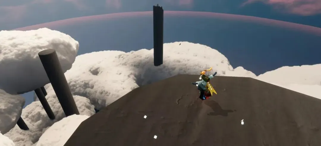 这上边有空气墙所以必须背背飞上来,但是也并非下不去的,朝原理树桩的方向走就行,到边缘就掉下去了,然后就是想通过这个边缘绕着飞上去是行不通的,因为它大概是那种夹角的风墙面,理解为单向通道就行了。