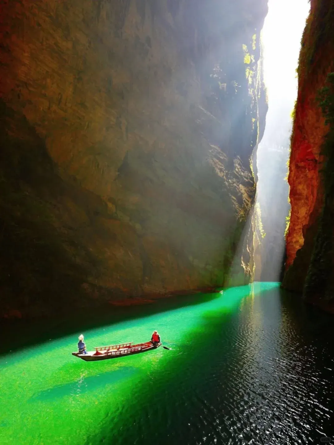 行家拍照时刻:务必在中午11点到下午2点之间,抵达谷底乘船处!只有这时候的阳光才能直射谷底,照出通透的“玻璃水”。去早了去晚了,水都是幽绿的,拍不出悬浮感。