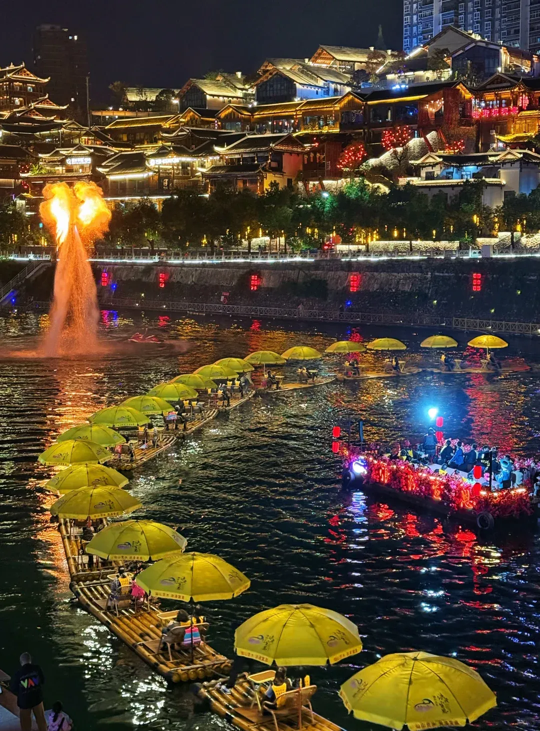 夜游高潮:晚上七点后,灯光亮起,广场上的免费大型土家民俗表演就开始了。别只顾着看,表演末尾的“摔碗酒”环节,大胆上去体验,花五块钱买碗酒,用力一摔,碎碎平安,特别解压!