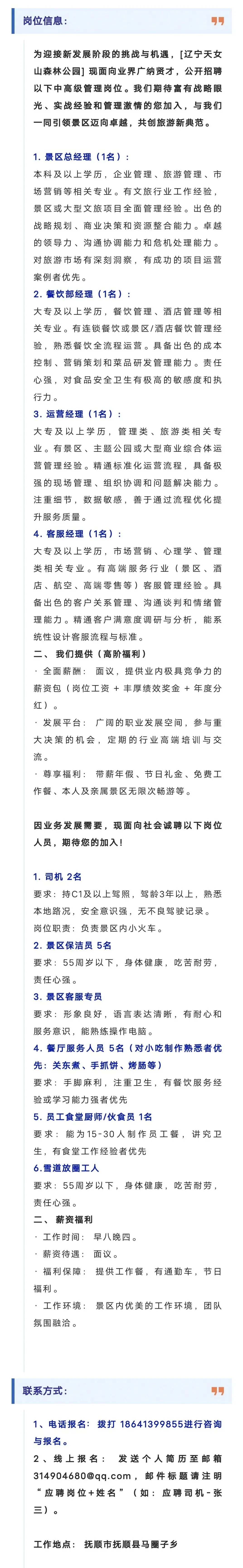 您现在的位置是:首页 > 国内旅游目的推荐 > 正文 国内旅游目的推荐 抚顺天女山景区诚聘以下人员 admin2026年01月23日 07:02:06国内旅游目的推荐1 抚顺天女山景区诚聘以下人员 转载请说明来源于"旅荐网",部分内容转载自网络,如有侵权请联系qlwl@foxmail.com删除 本文地址:https://www.15386.cn/post/85284.html 上一篇 长白山景区1月23日开放情况公告 下一篇 “互联网的茅台”:在线旅游巨头携程业绩亮眼,为旅游酒店市场赋能 相关文章 双龙景区交通规划开始专家论证,索道真的要来了! 黄山必去9大景点️毕业旅游来安徽真的值 山西旅行社高效应急处理旅游推荐攻略指南权威发布 2026寒假,春节最佳旅游路线推荐 1️⃣ 春节假期热门年味旅游地推荐 【君法速递】文化和旅游部 市场监管总局联合印发《2026年版团队合同(示范文本)》(内附:全文) 9吨纯电动吸扫车干扫车湿扫车价格景区滚扫车厂家报价 山西又一景区火了,被誉为 晋中小五台山,适合冬季徒步赏景 新西兰著名景区发生大规模滑坡,9人失联;更多恶劣天气在路上!在滑坡频发国,如何尽早识别滑坡保命? 大美中国内蒙平顶山火山群旅游景区 发表评论 取消回复 评论列表 这篇文章还没有收到评论,赶紧来抢沙发吧~