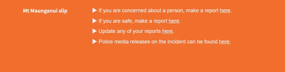 警方呼吁,任何担心可能有人在 Mount Maunganui 滑坡事故中失联的民众,请立即与警方联系。