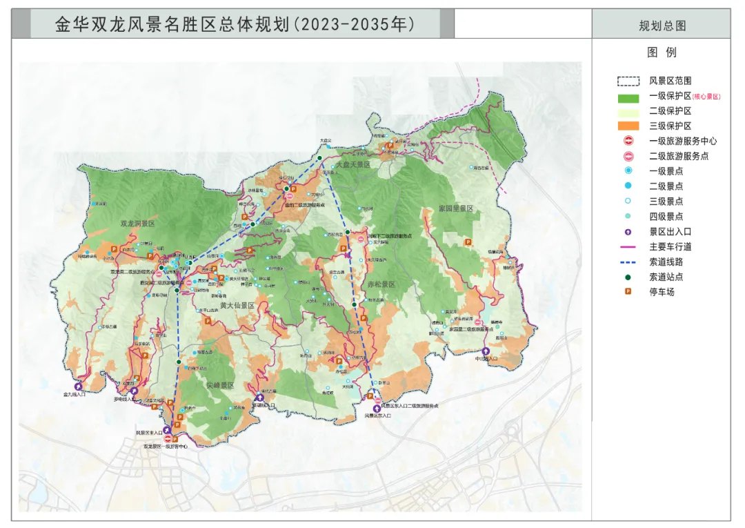 根据金华双龙风景名胜区总体规划(2023-2035年)(草案),景区内部交通总体形成“三横五纵一环”通道结构。“三横”包括:罗电线(新朝线-武平殿)、新朝线-赤黄公路、南线绿道;“五纵”包括:金九线、罗电线(花果路-新朝线)、新朝线南段、赤松乡道-规划索道、大源乡道;“一环”为精品索道环线,由东西段索道、南线绿道围合而成。