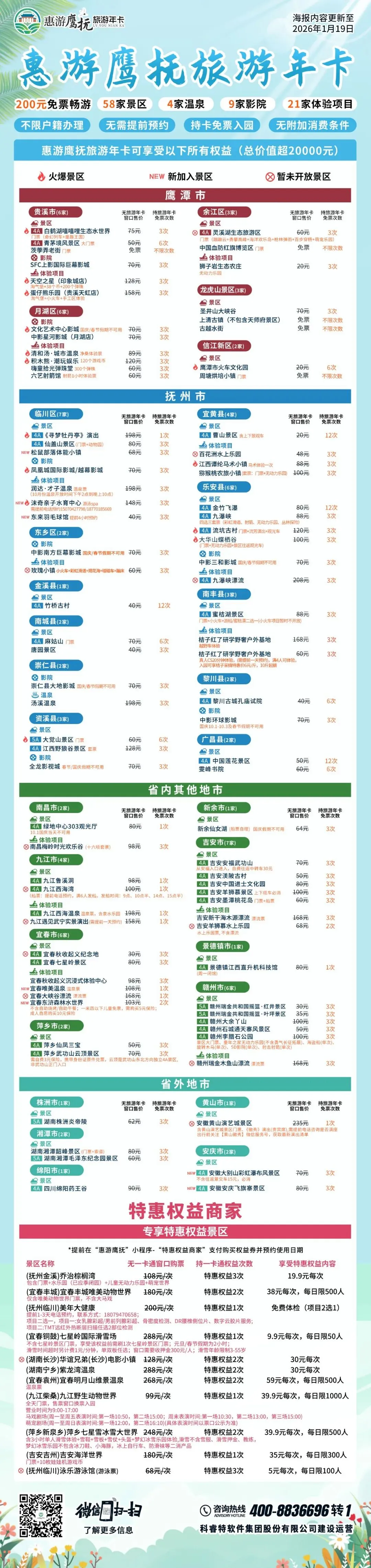 为了保障大家的出行及观演、观影体验,请在出行前拨打惠游鹰抚旅游年卡客服热线400-8836-696转1或者拨打景区电话咨询是否营业,且随时关注“惠游鹰抚旅游年卡 公园年票”官方公众号以及用户会员群内消息,并相互转告。
