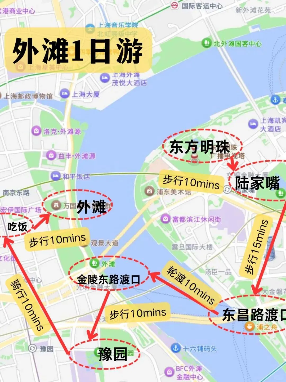 外滩源.(圆明园路)→ .外滩观景平.台 → 南京路步.行街. → 豫园.(.城外街巷)