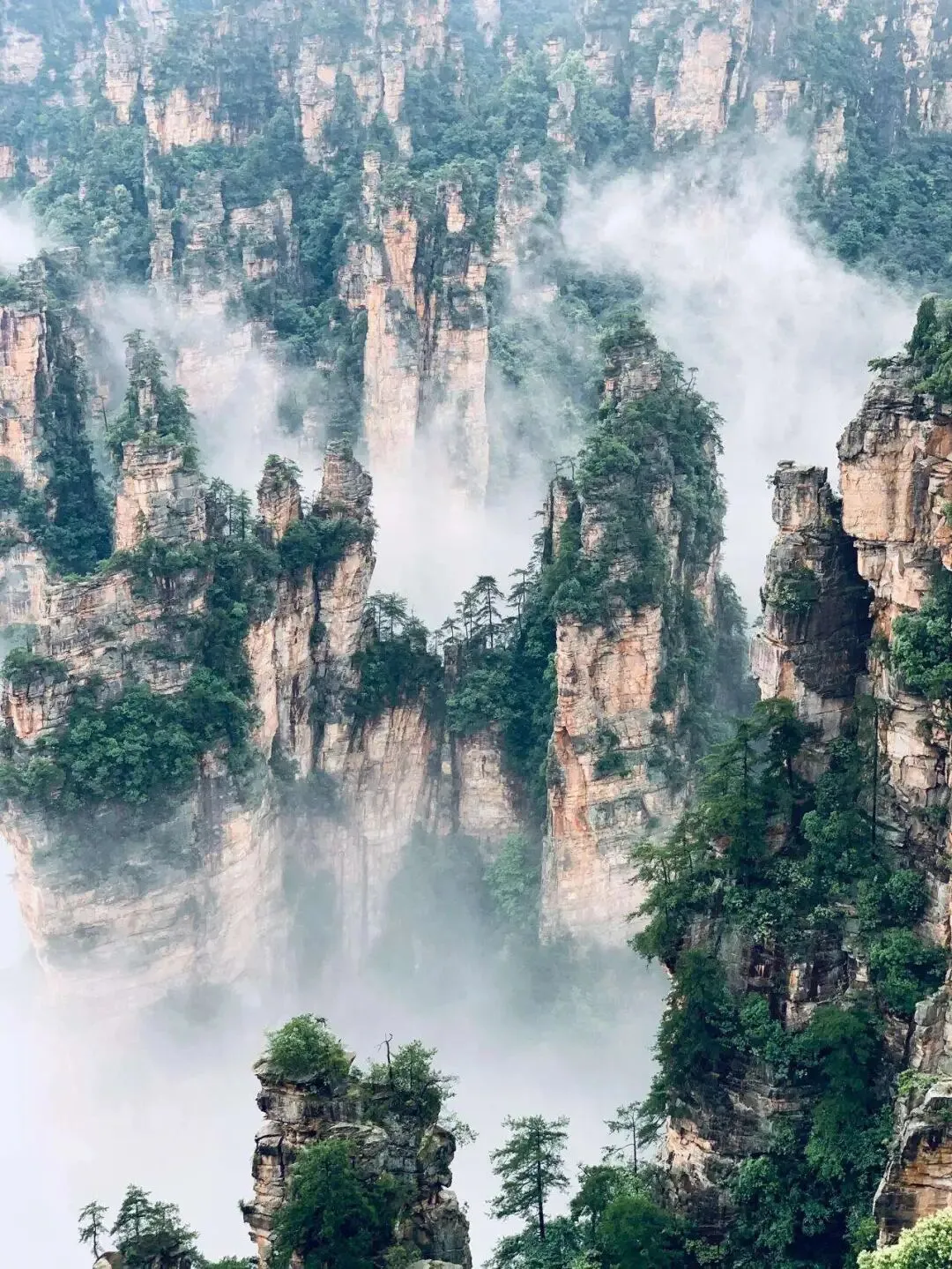 站在.袁家界的观景台上,那感觉不.是.看.山.,.是看一群沉默的巨人。石英砂岩的柱子一.根根拔地而起,顶上还顶.着几棵松.,像盆景放大了千万.倍.。雨后最好,云.雾从山谷.里.漫上来,缠.在山腰,那些“巨人”.就.只剩半个身子浮着,魔幻得很真实。