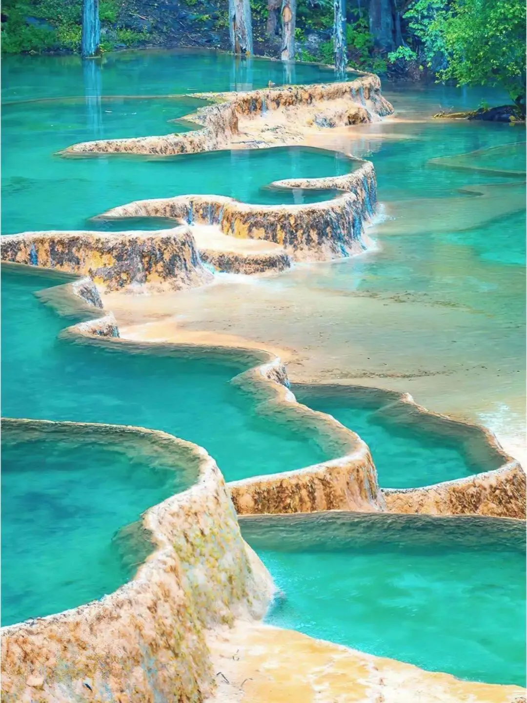 爬完那几公里.长的木质栈.道.,气喘吁吁.地站在五彩.池.边,.一口气才算顺过来。层层叠叠的.钙.华池像一大.片梯田,灌满了从雪宝.顶流下来的.水。天.晴的时候,池.子泛.着蓝绿.黄各种光泽,池底的树枝石头裹着厚.厚的钙.华,.像玉雕的.标.本。.它是.九寨沟的姊.妹篇,.但气质.更.像个不.食.人间.烟火的隐士。