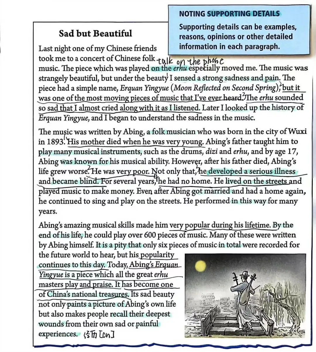 比如我们今年暑假去无锡听到了阿炳和二泉映月的故事,这学期的英语课本上就有这样一个一模一样的小故事。我发誓我不是专门去的,我就不是一个爱做计划的人,她学到哪里都不知道。还是上到这篇课文孩子回家告诉我的。
