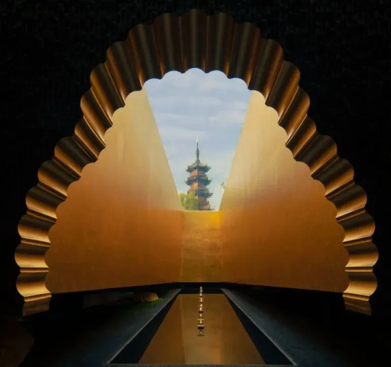 塔影空间坐落于徐家汇龙华古韵片区,毗邻龙华古寺,隐于塔影广场水域之下。这里藏书2000余册,设座位50个,是集阅读、休闲、艺术展示与文化传播于一体的静谧养心之所。空间巧借阳光、金箔、古塔与水池水波纹的互动,打造出水下观塔的独特体验。古塔光影随四时、天气变幻,虚实交织,景致时刻不同。其以中式美学为骨,处处暗藏中华建筑与文化智慧,尽显文雅韵味。