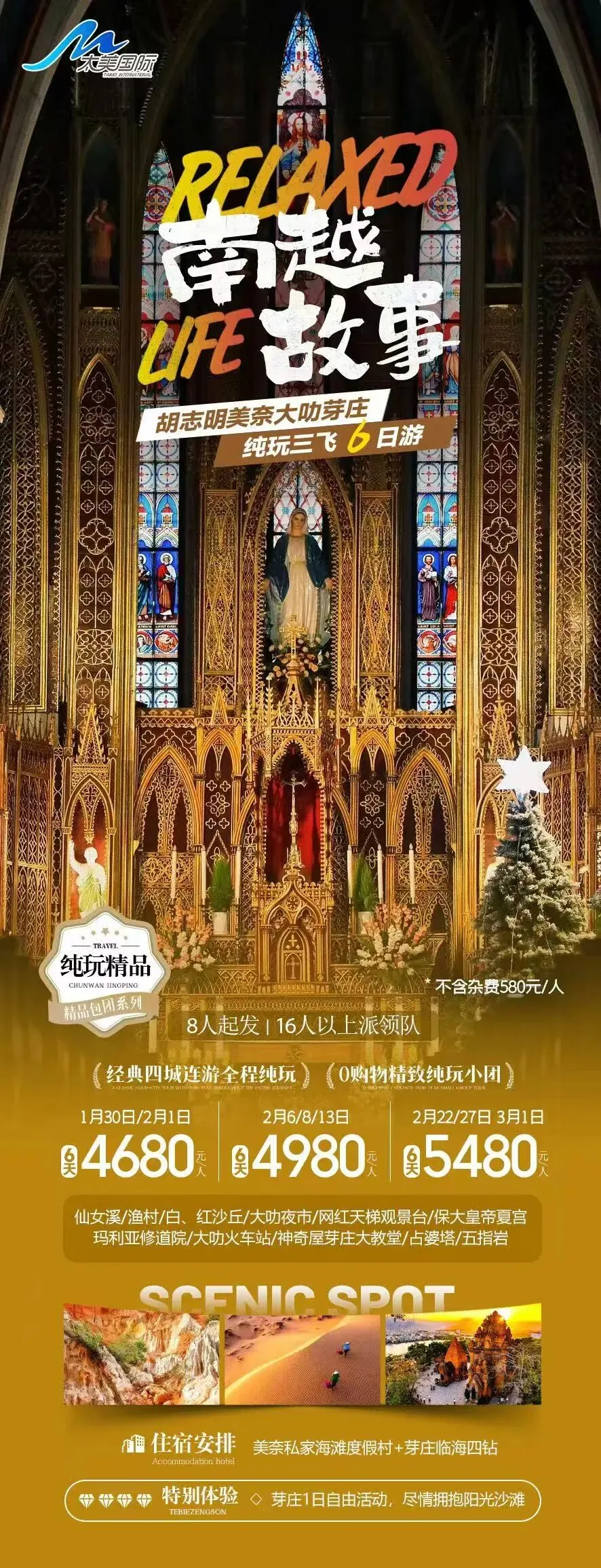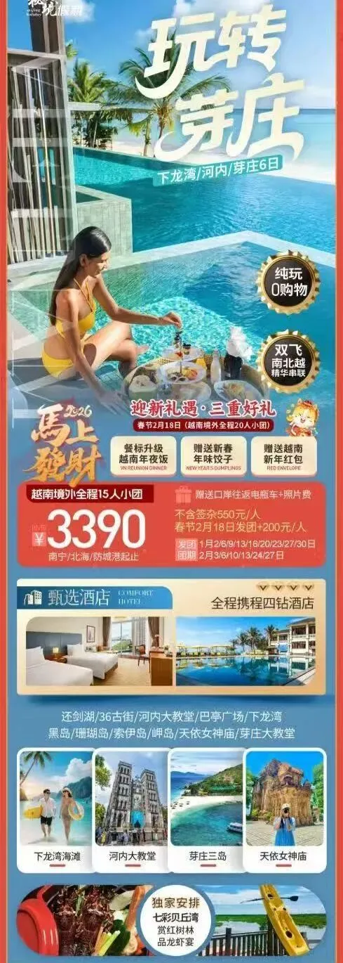 ● 越南时间比中国慢1小时,记得调整时间;芽庄全年平均气温28℃左右,春节期间温暖舒适,适合海滨游玩,需做好防晒。