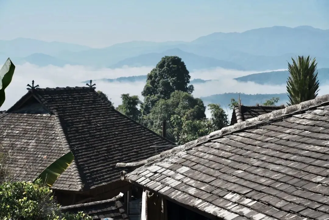 ▲静谧的村寨与云海,是布朗族人千年来赖以生存的家园