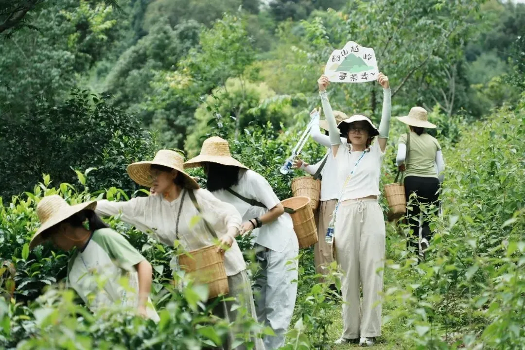 ▲和当地的好朋友们一起采茶,充满了欢声笑语