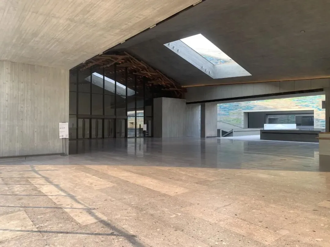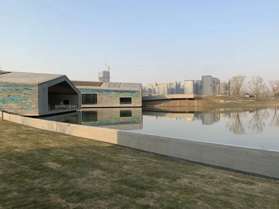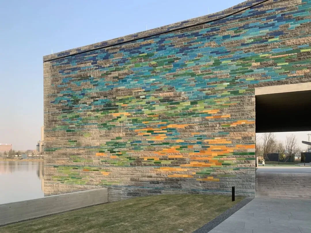 普利兹克奖得主王澍设计的西安歌剧院。这座歌剧院外形酷似秦岭山脉,与湖泊和公园融为一体,构成了一幅直径约650米的圆形景观,与大阪世博会环形场馆的直径大致相同。其外墙采用独特的石雕工艺和彩色瓷砖,仿佛描绘了一幅水墨画或印象派画作,展现了一幅崭新的长安水景。