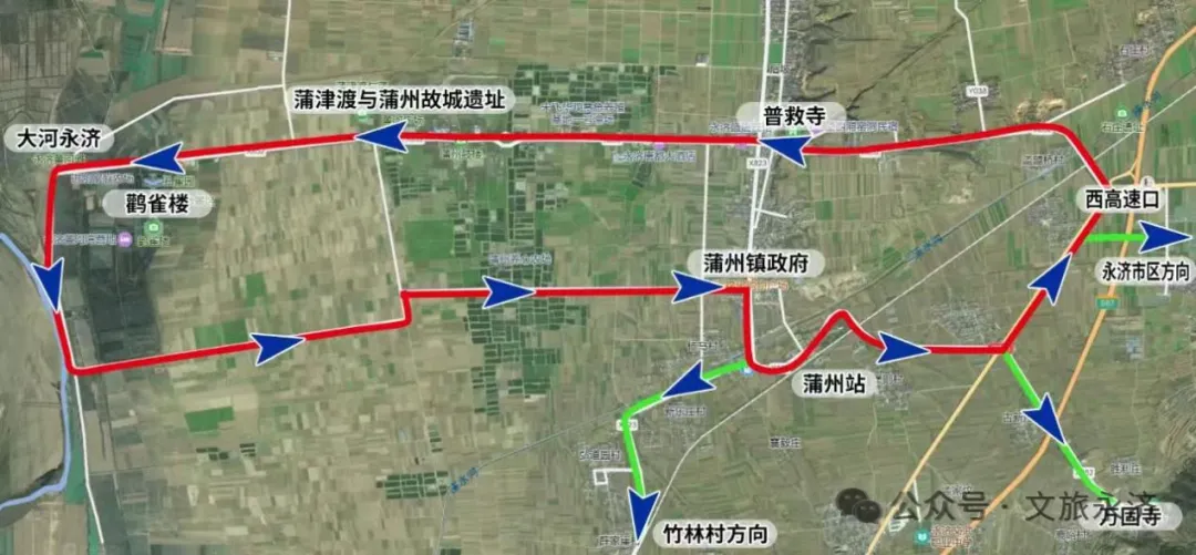 通行路线:普救寺景区→→蒲州古城遗址(黄河大铁牛)→→鹳雀楼景区旅游专线为单行路段,返程需行驶至鹳雀楼西黄河一号公路。