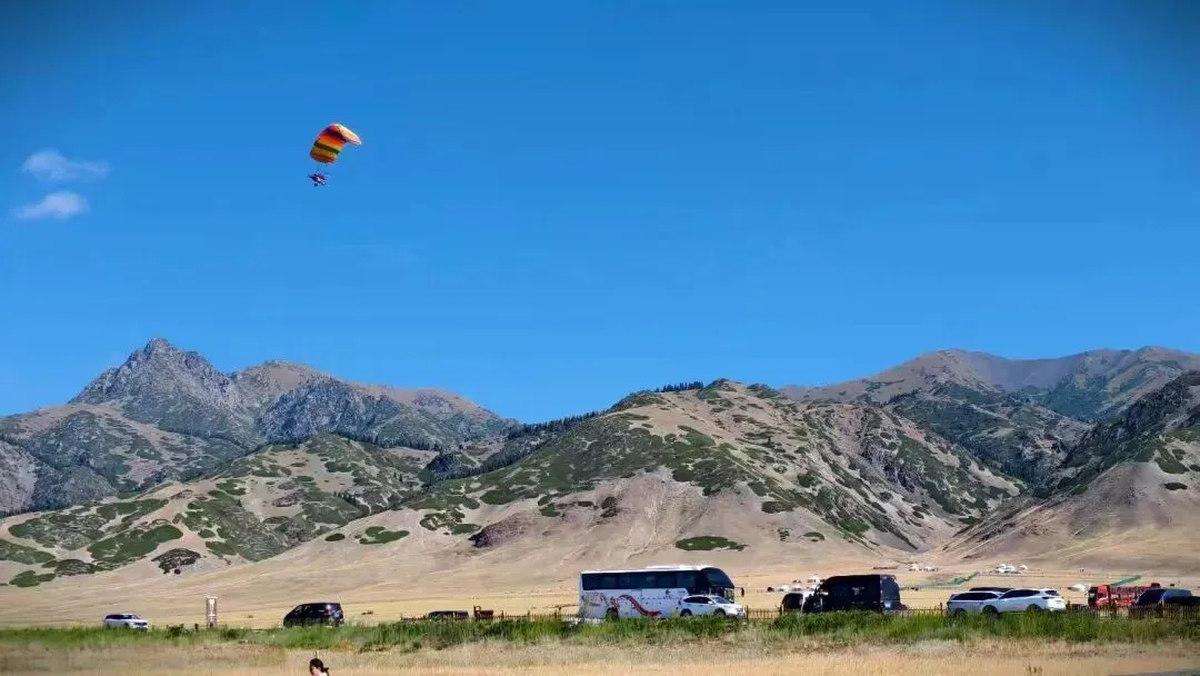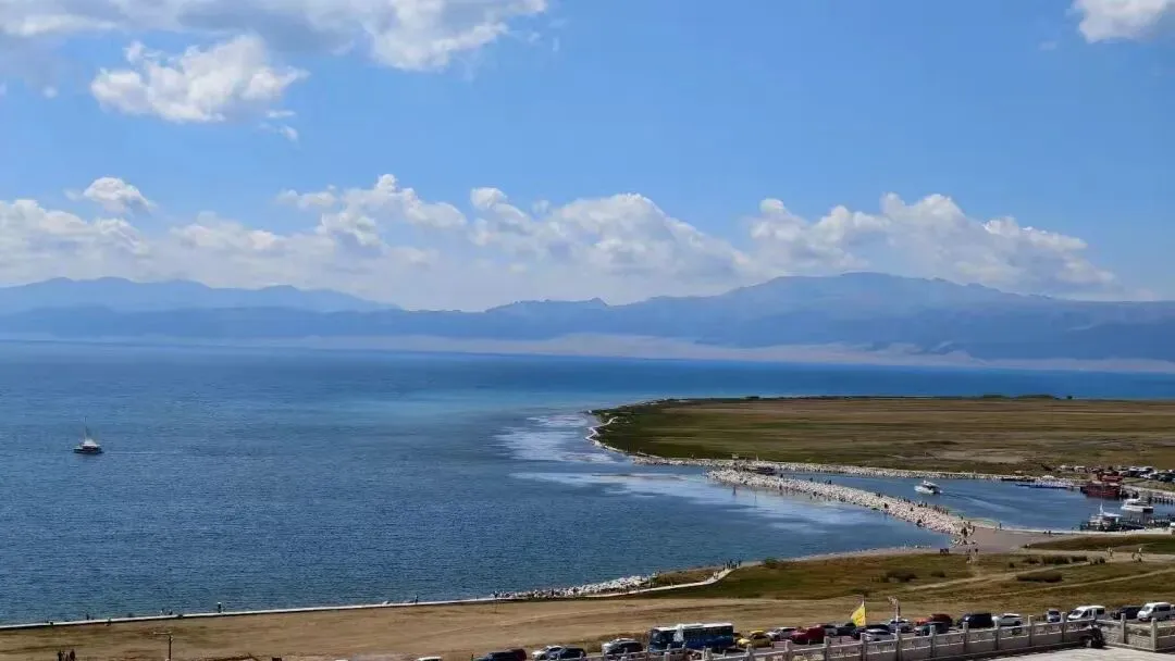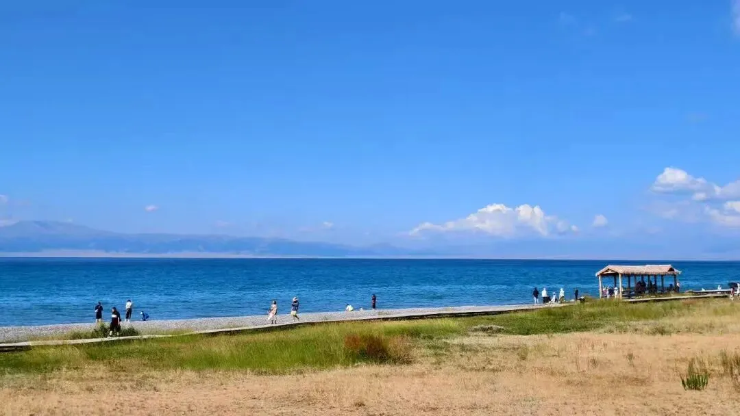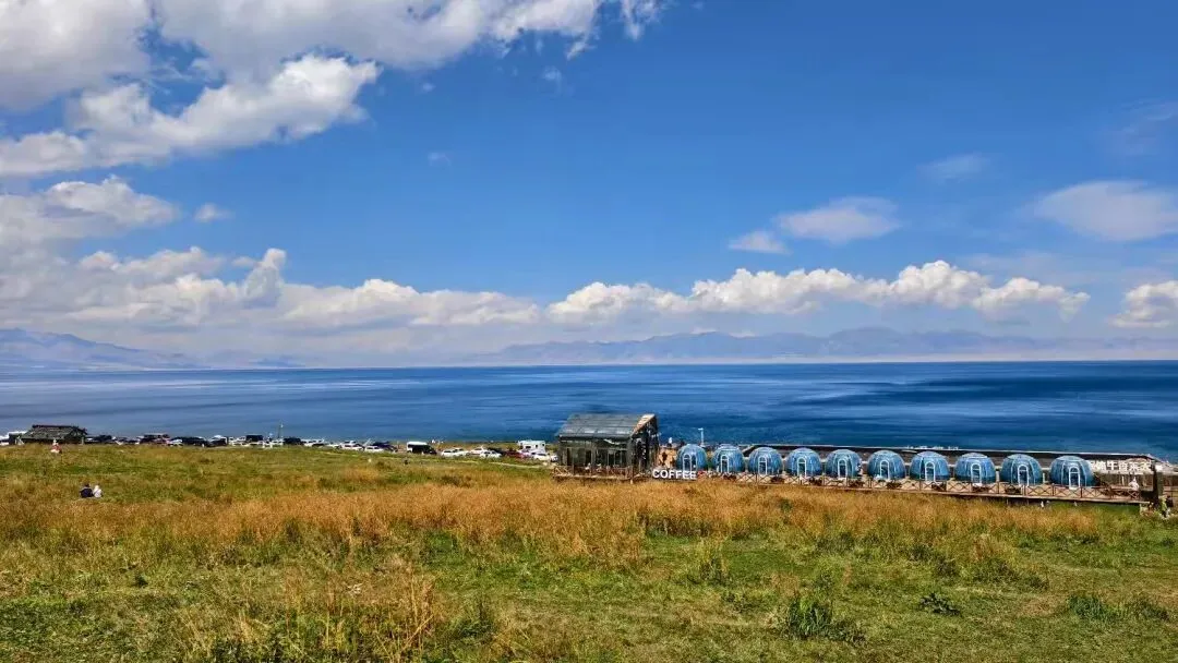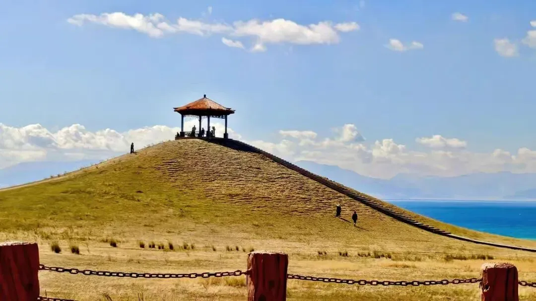 站在山顶,视野豁然开朗,完整的湖体如蓝丝绒铺展脚下,湖岸线勾勒出心形轮廓,同时能将果子沟大桥的壮丽景色纳入画面,是环湖92公里内唯一能同时收纳湖景与大桥的观景点。