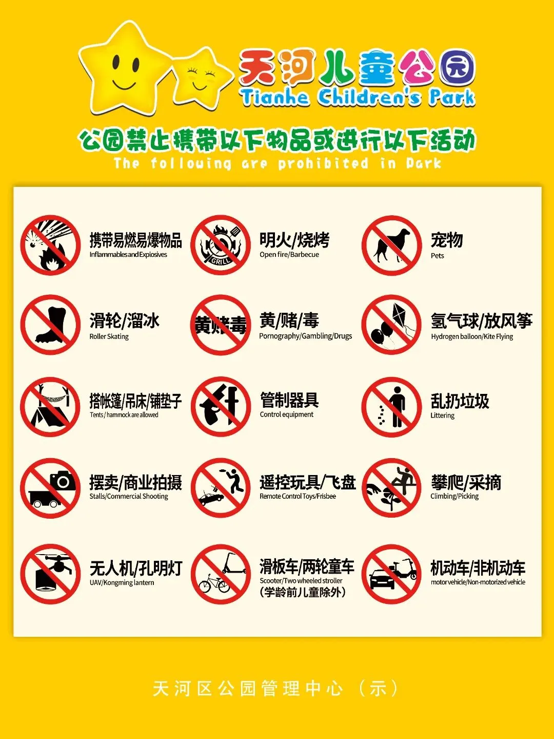 七、严禁在公园开展放风筝、轮滑溜冰、打鸟、遥控玩具、飞盘、使用小型飞行器“含无人机”等活动。严禁在非指定区域踢足球、打篮球。学龄前儿童需在成年人陪同下,使用两轮童车、滑板车。