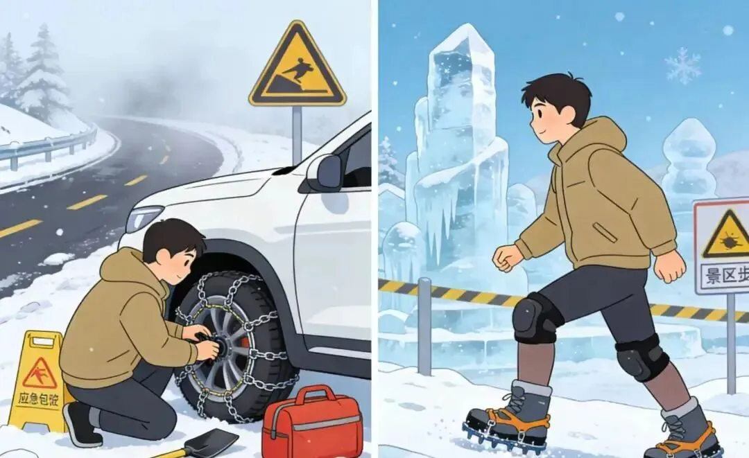 在景区冰雪路面行走时,穿防滑性能好的鞋子,行走时膝盖微屈、重心前倾,稳步慢行,不追逐打闹;经过冰雕、雪塑、护栏等设施时,保持安全距离,不触碰、摇晃,防止坍塌、磕碰受伤;留意景区内的警示标识,不翻越、不靠近危险区域。