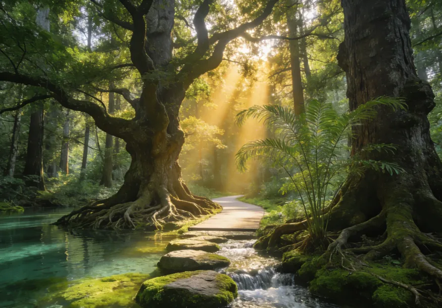 沿着蜿蜒的步道穿梭其中,脚下是潺潺的流水,时而没过脚背,带来丝丝凉意。身旁的树木形态各异,有的树干粗壮,枝叶繁茂,仿佛是这片森林的守护者;有的则纤细婀娜,随风摇曳,展现出别样的柔美。阳光透过树叶的缝隙洒下,形成一道道金色的光柱,照亮了水面和周围的青苔,使整个水上森林充满了梦幻般的色彩。在这里,你可以近距离感受大自然的神奇创造力,惊叹于树木与流水和谐共生的奇妙景象,仿佛与大自然融为一体,忘却尘世的喧嚣。