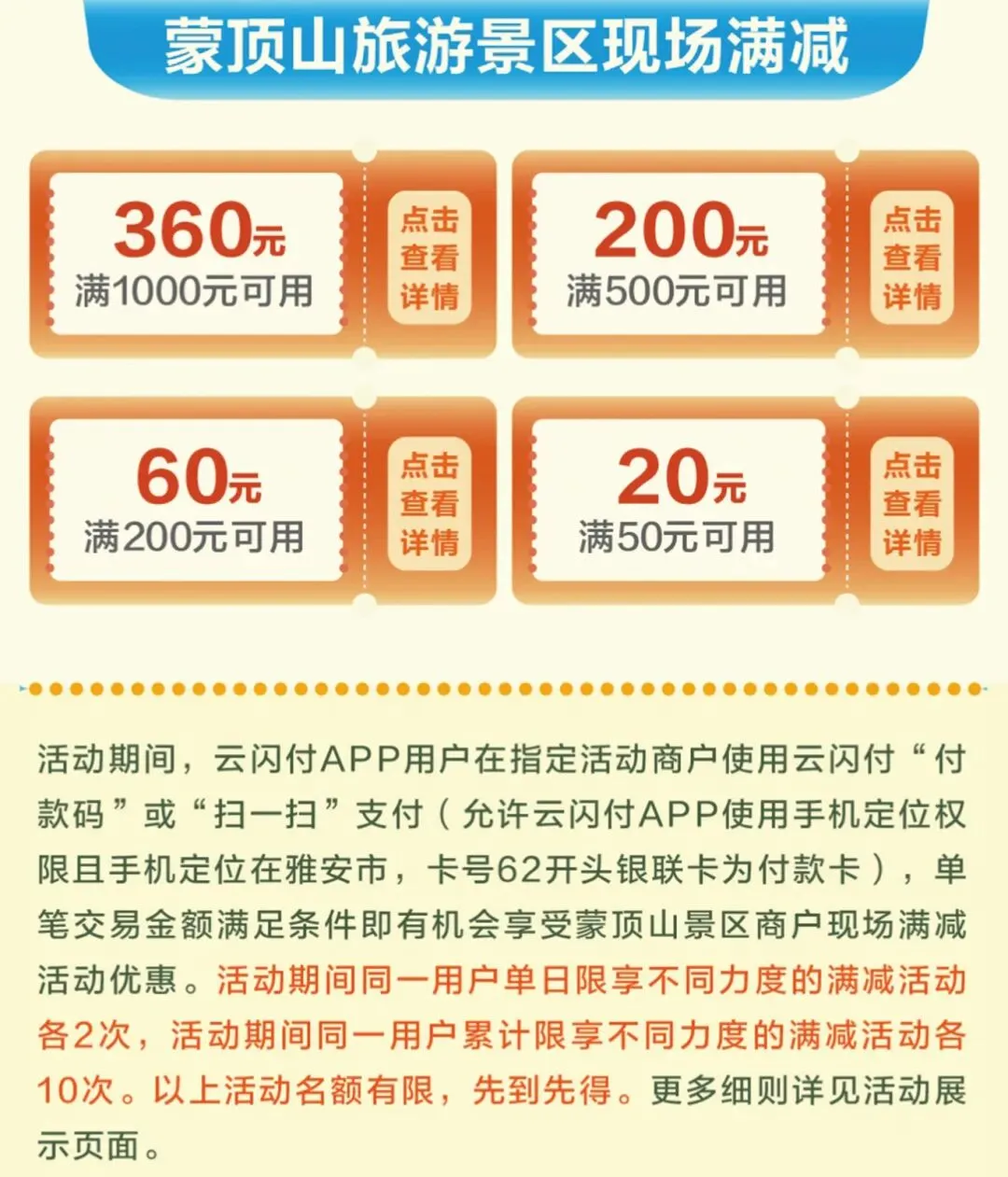 在蒙顶山景区内指定点位消费,使用云闪付APP支付即有机会享受满减优惠!