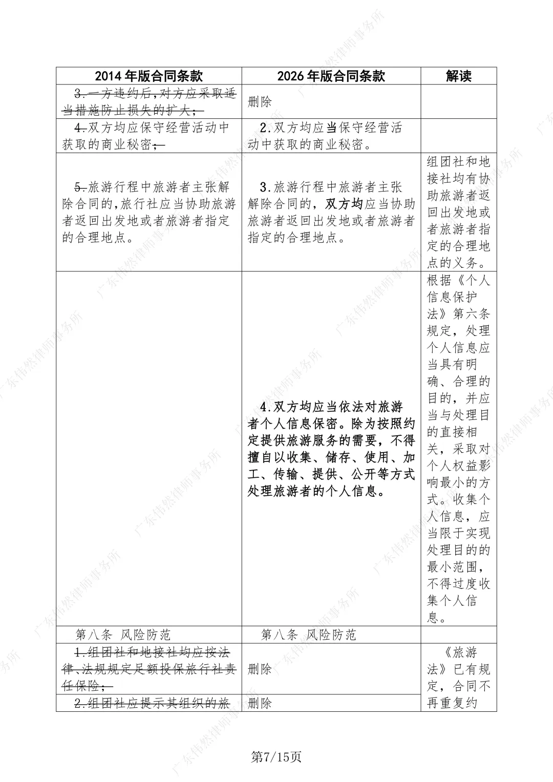 将《个人信息保护法》规定写入合同,要求旅行社除为合同履行的需要外,不得擅自以收集、使用、传输、买卖等方式处理旅游者的个人信息,明确旅行社泄露旅游者个人信息的责任,进一步规范旅行社经营行为。