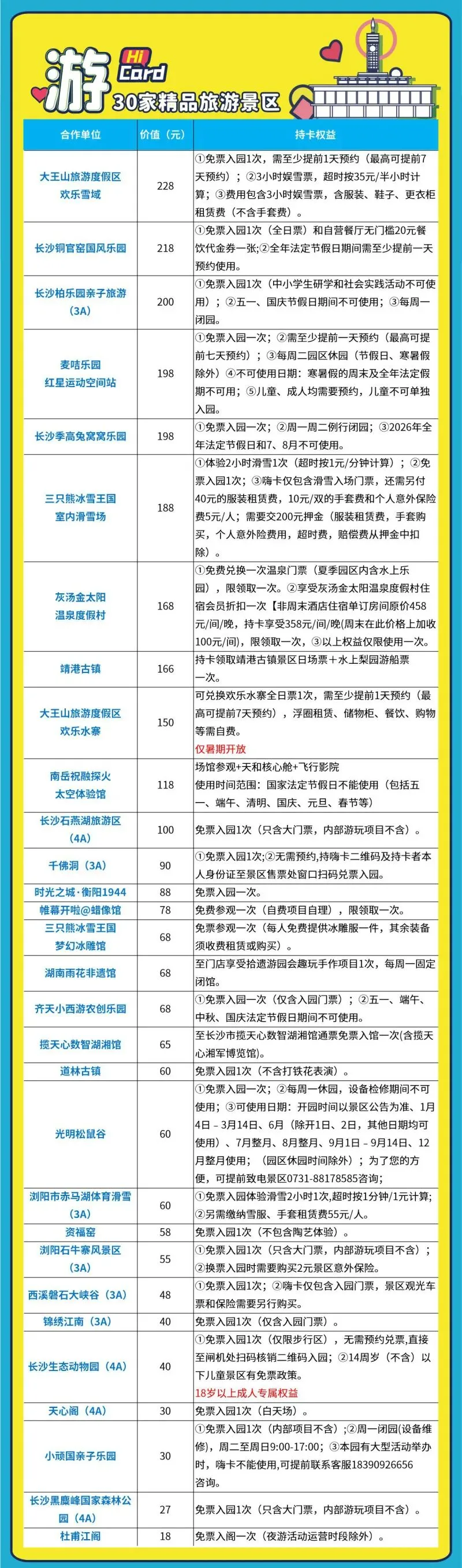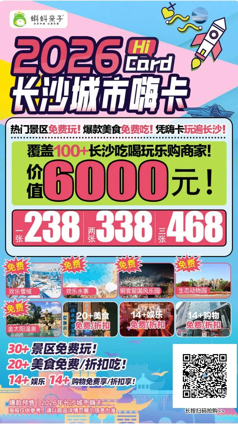 30+景区免费玩!欢乐雪域/欢乐水寨/铜官窑/动物园/靖港古镇/金太阳温泉/麦咭乐园/兔窝窝...等等通通免费! 更有20+美食免费吃! 15+娱乐 14+购物免费享/折扣享! 大人小孩男女老少都可用!超长有效期到26年年底! 长沙游吃娱购行超级免费折扣卡!长沙城市旅游一卡通! 26年首发特价3张468元!0.26折!单张总价值超6000元! 亲子遛娃、温泉雪水、景区展馆、美食休娱、自用送人,超省钱!超好用!