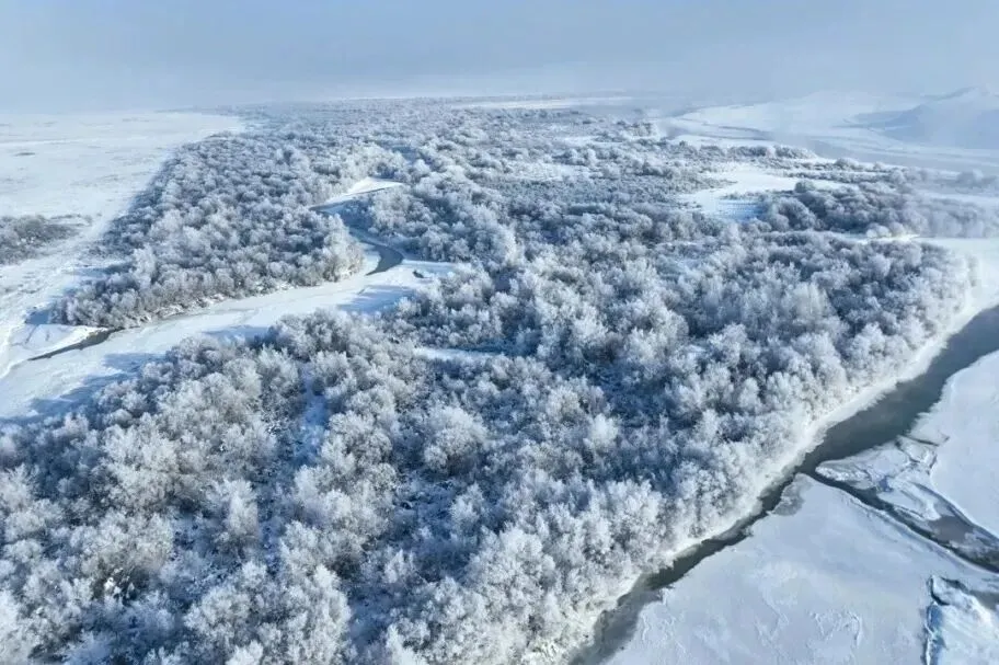 冬季的昭苏湿地公园,是一幅生机勃勃的冰雪秘境画卷。每年约11月中旬至次年2月,公园会出现大片雾凇。挂满冰晶的树木远望如珊瑚,近看像梨花,宛如童话世界。