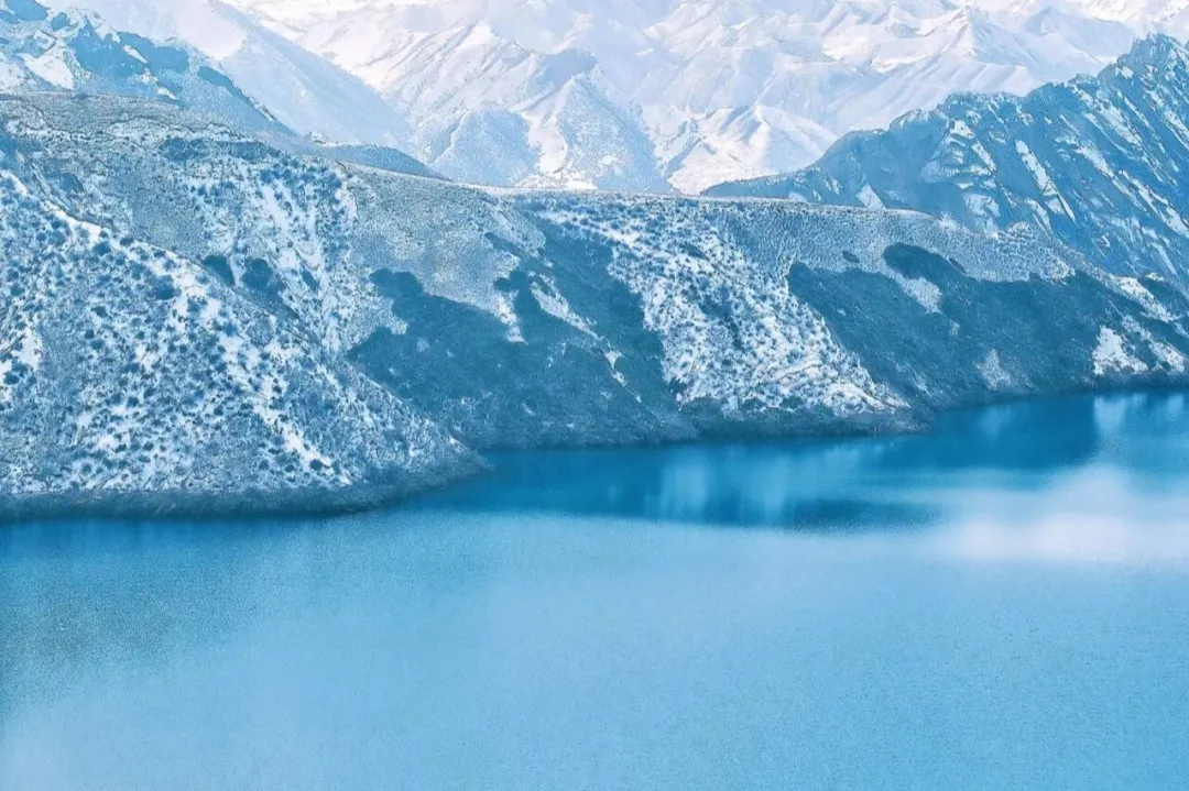 冬季的肯斯瓦特景区化身为纯净的冰雪秘境。湖水凝为静谧的蓝冰,与覆盖其上的白雪形成鲜明对比。这座由玛纳斯河筑坝而成的静谧水库,集柔水、苍山、于一身,是绝佳的摄影秘境与自然课堂。