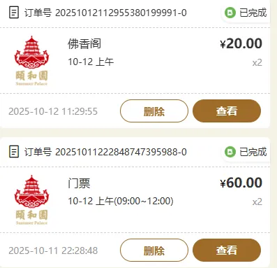 颐和园的门票在微信小程序【颐和园官方在线购票】,十月份是旺季,门票(仅限大门)30元/人,提前一天买也来的及。可以联票,也可以分景点买。我们计划的半天时间,就怕时间来不及,所以只买的门票,根据情况买单个景点的门票。后面我们格外10元/人,进了佛香阁。要去的伙伴可以根据自己需求来选择。