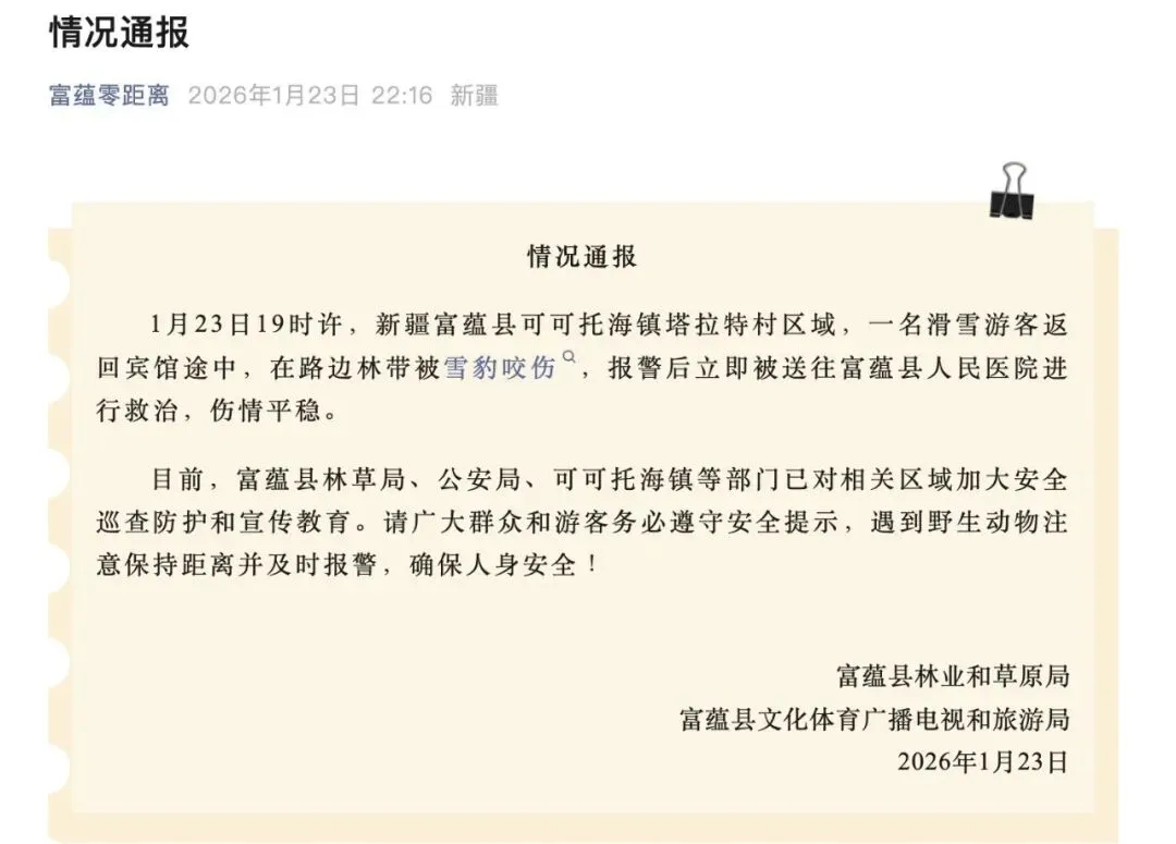 据媒体报道,1月23日下午,新疆可可托海景区外宝石沟附近发生雪豹伤人事件,伤者已送医救治。 1月23日晚,富蕴县林业和草原局、富蕴县文化体育广播电视和旅游局通报:1月23日19时许,新疆富蕴县可可托海镇塔拉特村区域,一名滑雪游客返回宾馆途中,在路边林带被雪豹咬伤,报警后立即被送往富蕴县人民医院进行救治,伤情平稳。目前,富蕴县林草局、公安局、可可托海镇等部门已对相关区域加大安全巡查防护和宣传教育。请广大群众和游客务必遵守安全提示,遇到野生动物注意保持距离并及时报警,确保人身安全!