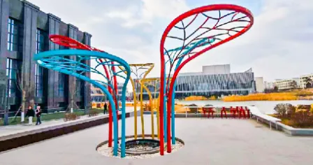 取自王安石《登飞来峰》“不畏浮云遮望眼”,景观装置以“月光穿透云层”为设计,寓意“突破迷雾、坚定前行”。夜晚灯光亮起时,宛如“月光洒校园”,氛围感拉满。