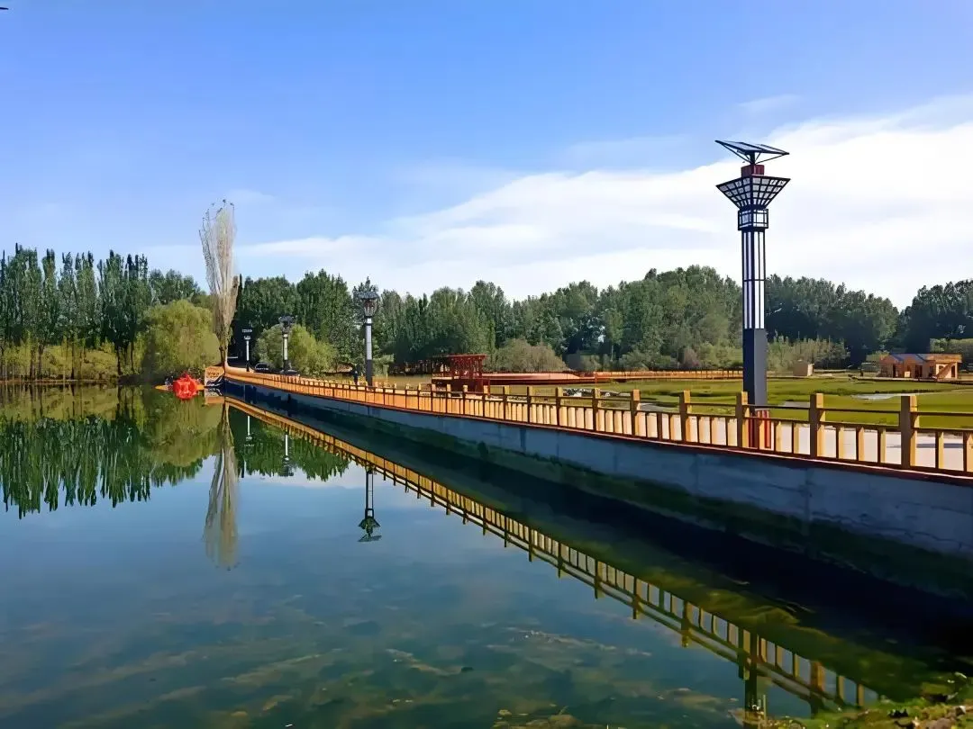 戈壁变绿洲:原为干涸荒凉的戈壁石滩,通过引水造湖、植被重建,形成水草丰茂的生态廊道。