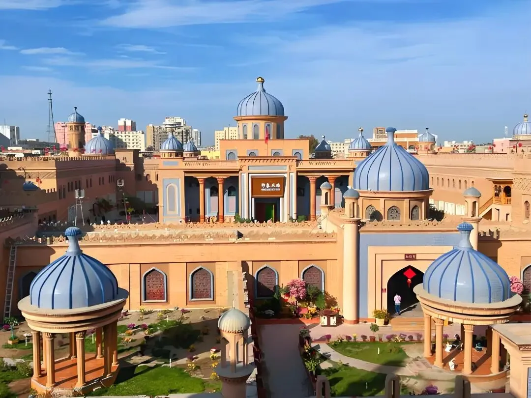 建筑风格复建叶尔羌汗王宫旧址,融合维吾尔传统建筑、伊斯兰元素(蓝色花砖、镂空花纹、穹顶)及宫廷布局,以土黄色为主基调,辅以砖雕、木雕、陶瓷等工艺。