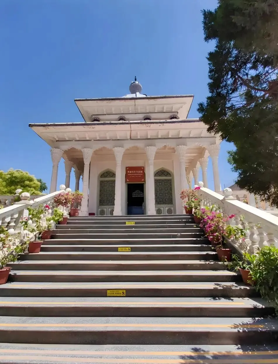 建筑融合伊斯兰风格,顶部为圆塔状拱北(穹顶),内部三层结构:底层为主墓室与环形走廊,中层为过渡八角形设计,顶层为蓝色瓷砖装饰的拱顶。墙面镶嵌“十二木卡姆”曲名浮雕,内部壁画讲述王妃生平,是音乐与文化遗产的重要象征。