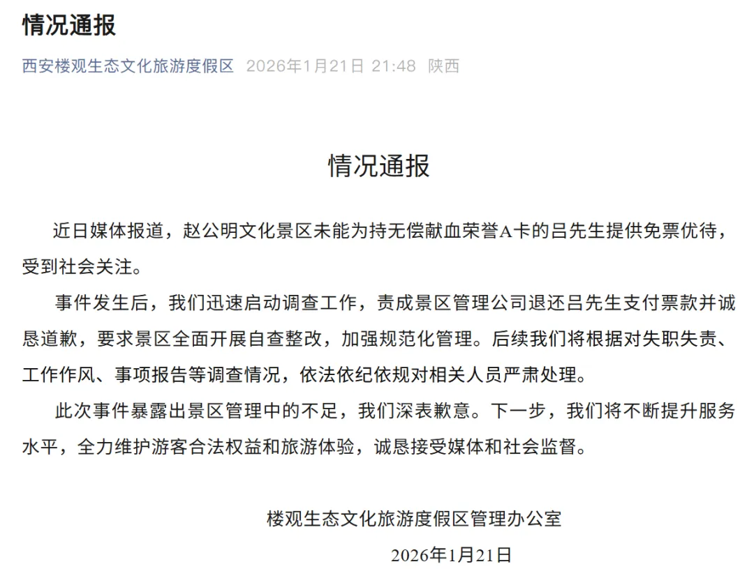 1月21日晚,西安楼观生态文化旅游度假区官方微信公众号发布情况通报。通报称,赵公明文化景区未能为持无偿献血荣誉A卡的吕先生提供免票优待,事件发生后,度假区迅速启动调查工作,责成景区管理公司退还吕先生支付票款并诚恳道歉,同时将依法依纪依规对相关人员严肃处理。