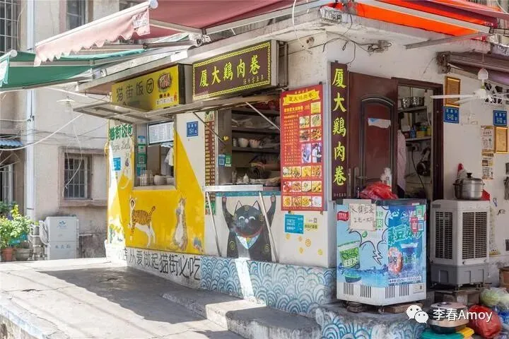 猫街内还有许多特色小吃,一家叫做厦大鹅肉饭的小店格外强占风骚,斑驳的墙面上,画着猫咪嬉闹的场景,让人忍不住驻足停留。行走在猫街,随处可见猫咪的身影,一个转身就能与猫咪来一段完美邂逅,无疑是爱猫人士的天堂。