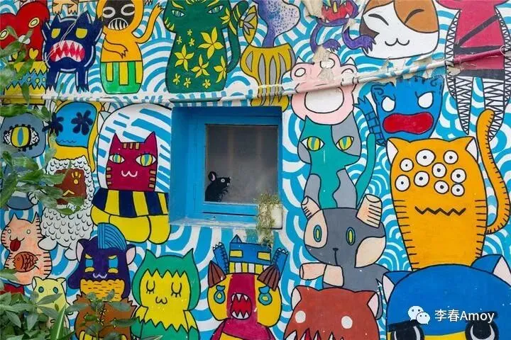 猫街的房屋虽然大多破旧不堪,但是经过人工的稍加修饰,又变成了一道亮丽的风景线,搞怪的涂鸦将整个墙面填充,各种鲜艳的色彩相互碰撞,营造出一种活泼欢快的氛围,让人忍俊不禁的是,狭小的窗子一侧,还有一只可爱的老鼠悄悄探出头来,活生生成了阶下囚。