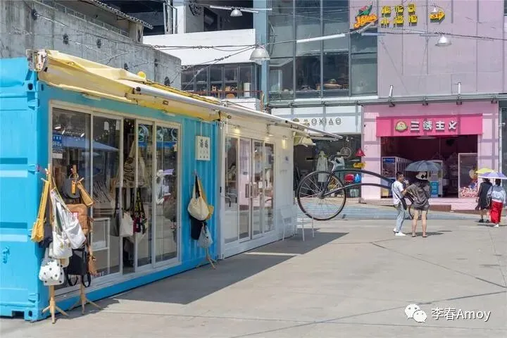 这里还坐落着一些饰品店,那些看似不堪一击的小店面,都凝聚着年轻人的青春热血,这座用组装箱构成的小店,蓝白相间,门口的帆布袋无拘无束,尽情展现青春力量。透过橱窗可以看出,这是一家卖包包的文艺小店,不需要过多的修饰,风格鲜明,好看就完事了。