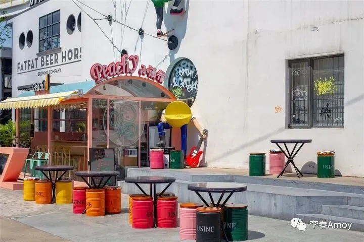 除了精致的电话亭,这里的小酒馆设计更是大胆时尚,一个个木凳采用油桶设计,颜色的简单组合,将艺术玩弄于鼓掌之中,不得不佩服老板的艺术情怀,如此夺人眼球的设计,的确让人叹为观止。当然,小酒馆的惊喜之处远不止餐桌,瞧着门前的吉他手,通过道具的肆意组装,构成一幅亮丽的风景线,将小酒馆的格调彰显得淋漓尽致。