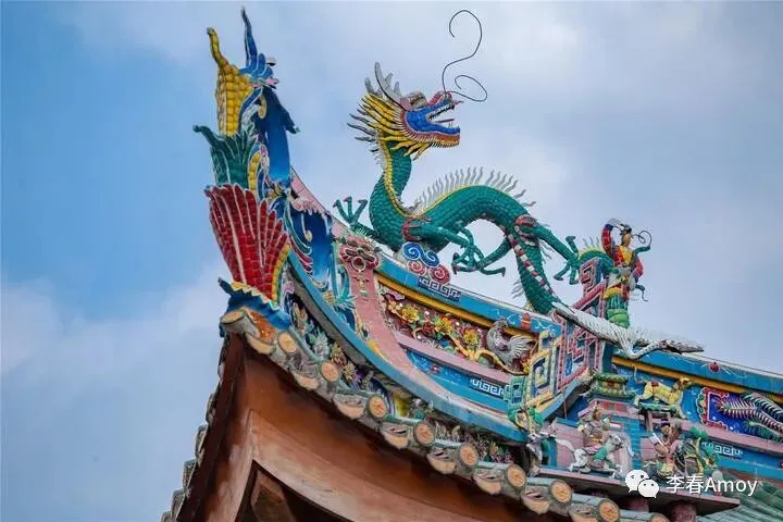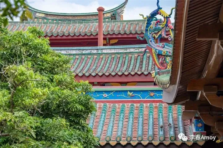 法堂的建筑则显得更加质朴,木雕镂空设计使建筑看上去更加静美,法堂前花团锦簇,虽然不提供参观,但仍有一些游人来此参拜,只为表达虔诚之心。寺内的绿化面积很大,到处生机勃勃,屋檐精致的飞龙格外夺目,雕塑以蓝白红为主调,精致而不妖娆,向世人展示南普陀独有的风采。