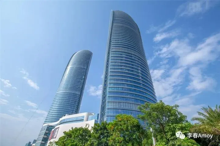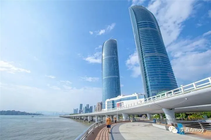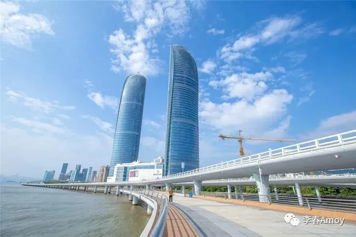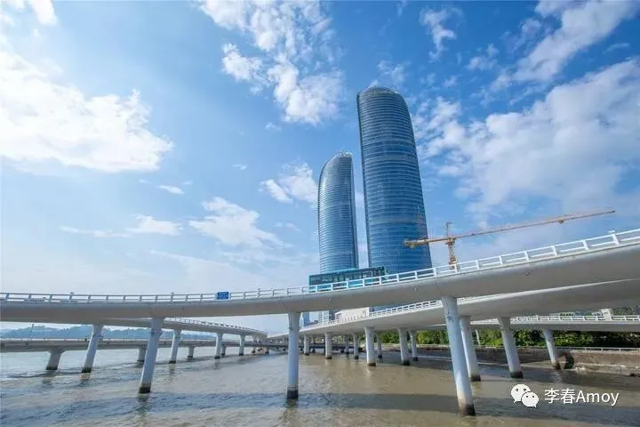 站在观景台上远眺,可以将300米高的双子塔一览无遗,在蓝天的映衬下,流线十足的双子塔高耸入云,蓝色的外观与天空融为一体,在太阳的照射下熠熠生辉,将厦门的繁盛诠释得淋漓尽致。作为一项地标性建筑,无一不在向游人诠释厦门之美。双子塔身后则是演武大桥,实则相隔较远,站在观景台上远眺,竟有种触手可及之感。