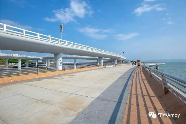 演武大桥于2003年正式通车,大桥采用鱼腹式梁、椭圆型墩,桥身通体为白色,与远处的碧海蓝天相互衬托,毫无违和感,在这里,除了蓝白绿,几乎找不到第四种颜色来打扰。演武大桥临海见海,被誉为世界上离海平面最近的桥梁。为了满足游人对厦门的无限向往,演武大桥设有免费观景台,观景台由三座栈桥和滨海步道组成,整个观景台由完整的曲线构成,没有一丝棱角,缓缓延伸至厦门湾,显得无比温柔。