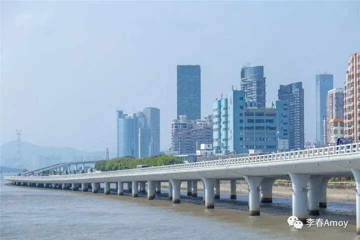 崭新的公交车在大桥上驰骋,蓝白相间,将厦门的城市风貌诠释无遗。更让我惊喜的是演武大桥的桥身设计,无限趋向于海平面,但却充分考虑到潮涨潮落,看到这里,不得不感叹中国的基建力量。